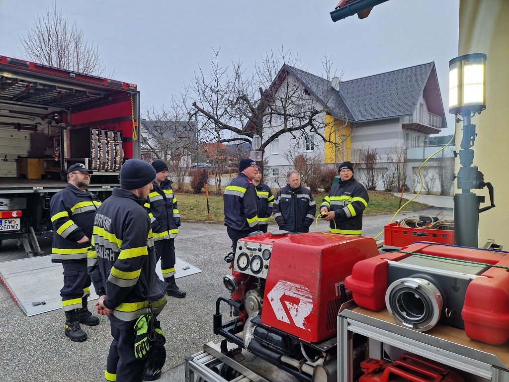Am Faschingssamstag dem 14. Februar 2026 fand traditionell unsere erste Monatsübung im neuen Jahr statt. Als Übungsleiter zeigte sich Gruppenkommandant Hauptlöschmeister (HLM) Gernot Pötz verantwortlich. Die insgesamt 15 Übungsteilnehmer wurden auf zwei Gruppen aufgeteilt. Bei Station 1 befasste man sich zum einen mit dem Abschleppen eines Unfallfahrzeuges mit der zur Hilfenahme unserer Abschleppachse sowie zum anderen mit der Inbetriebnahme unseres 100kvA Notstromerzeugers. Bei Station 2 wurde unsere Tragkraftspritze (TS) von unseren Maschinisten in Betrieb genommen, ebenfalls wurden unser Lichtcontainer und der Katastrophenhilfsdienst (KHD) Hochwassercontainer in Augenschein genommen. Abschließend gab es noch eine Schulung mit unserer elektrischen Seilwinde am LKW-A.